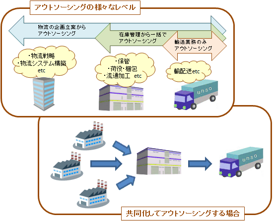 一方で、「トラック会社にうまくサービスを移管できるだろうか…」といった疑問をお持ちの荷主企業も多いと思います。現在では、物流企業は様々な種類のアウトソーシングに対応できる会社が増えてきていますので、そのような会社を選定すれば、荷主企業の戦略に合わせて自営転換を図ることができます(図表2)。